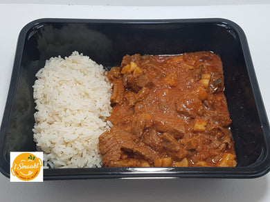 Stoofvlees van everzwijnen met gekookte aardappel en gevulde appel
